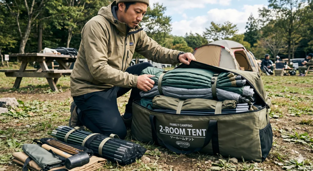 特に初心者ファミリーにとって、大型の2ルームテントは最大の難関です。畳み方がわからず、無理やり袋に詰め込もうとしてチャックが閉まらない。パパが格闘している間にママは子供の相手で手一杯。そんな「撤収パニック」を回避し、スマートにキャンプを締めくくるためのテクニックを伝授します。
